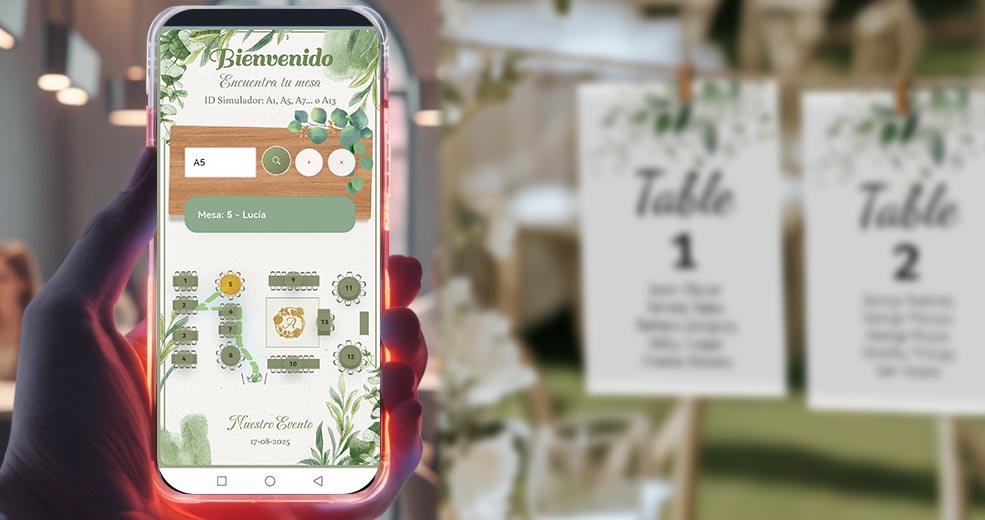 Para wedding planners y coordinadores, esta herramienta representa una ventaja competitiva. Permite realizar cambios de último momento en tiempo real, elimina los costos de impresión de carteles y mamparas, y garantiza que cada asistente encuentre su lugar de forma rápida y sencilla. Además, el sistema se puede personalizar con la identidad visual del evento, manteniendo la estética cuidada que tus clientes buscan.