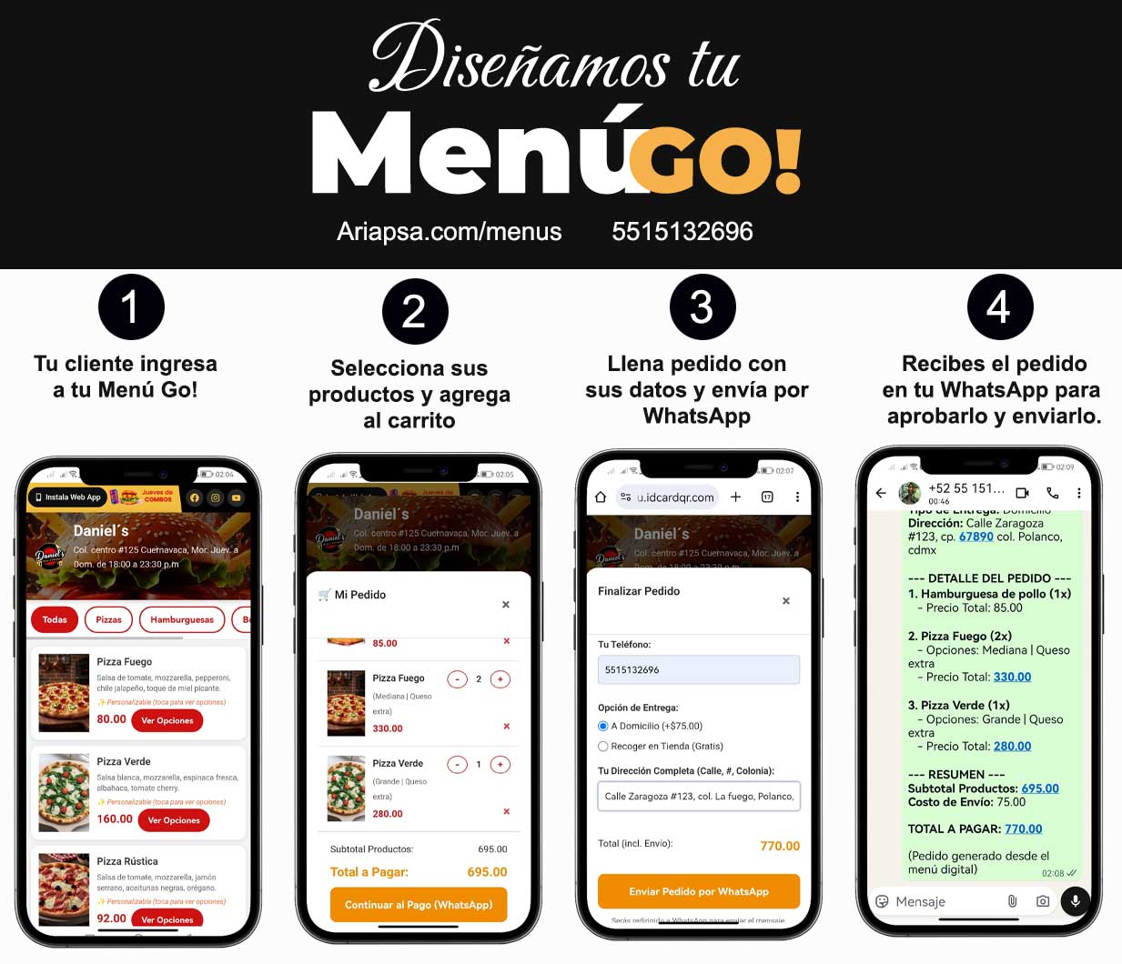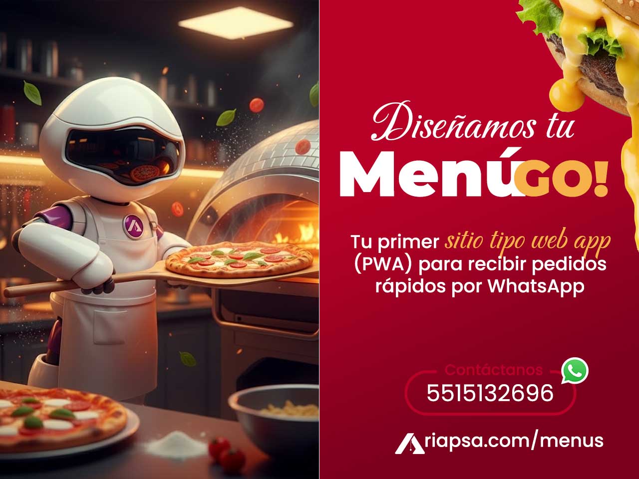Menú Go! es un sitio web tipo Web App (PWA) que permite mostrar tu menú digital a tus clientes, agregar productos a una cesta y realizar pedidos directamente a través de WhatsApp. Los pedidos llegarán al número que tú elijas, sin intermediarios.