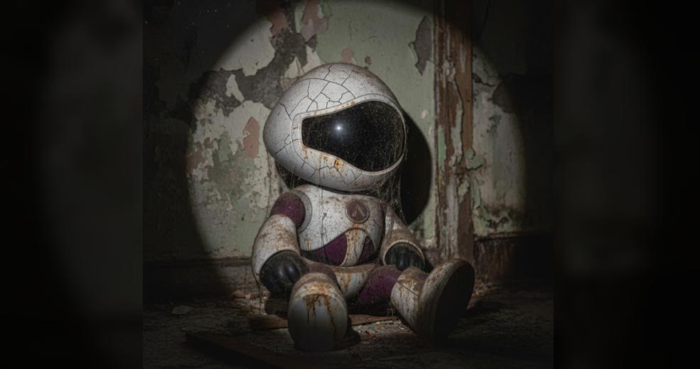 The subject (person, object, or character) is abandoned in a decayed environment, discovered during urban exploration.
