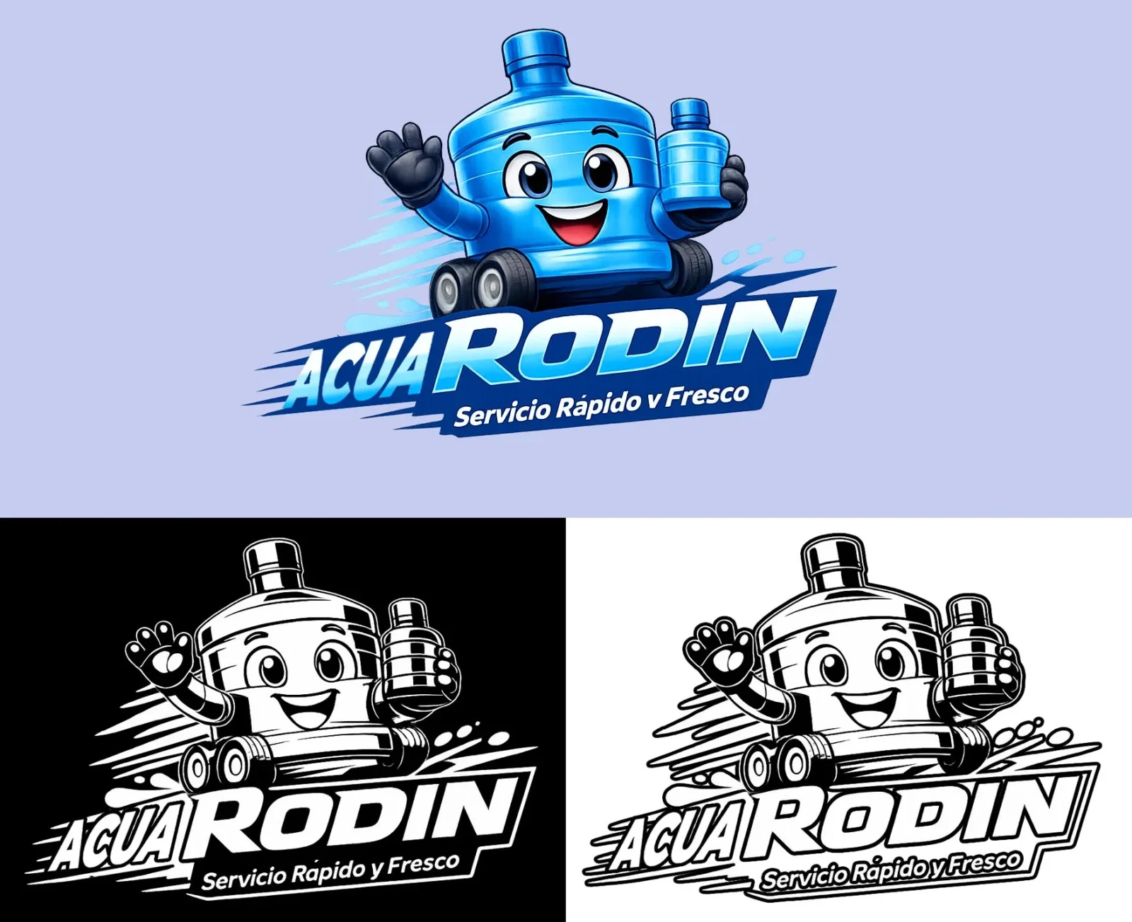 ACUA RODIN representa movilidad, frescura y rapidez en la entrega de agua purificada. La mascota, un garrafón caricaturesco sobre ruedas, transmite dinamismo y cercanía, mientras que la tipografía angular refuerza la idea de eficiencia y servicio ágil. El eslogan “Servicio Rápido y Fresco” resume la promesa de valor: agua limpia, entregada con simpatía y puntualidad.