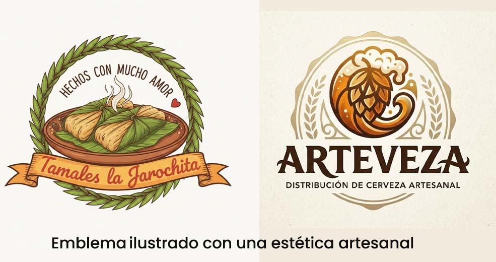 ¿Por qué es un emblema ilustrado? La estructura central (los tamales y el humo) está abrazada por una corona de hojas y un listón inferior. Aunque los bordes son más orgánicos que el caso anterior, la jerarquía visual obliga a que el nombre y el símbolo convivan en un mismo núcleo.